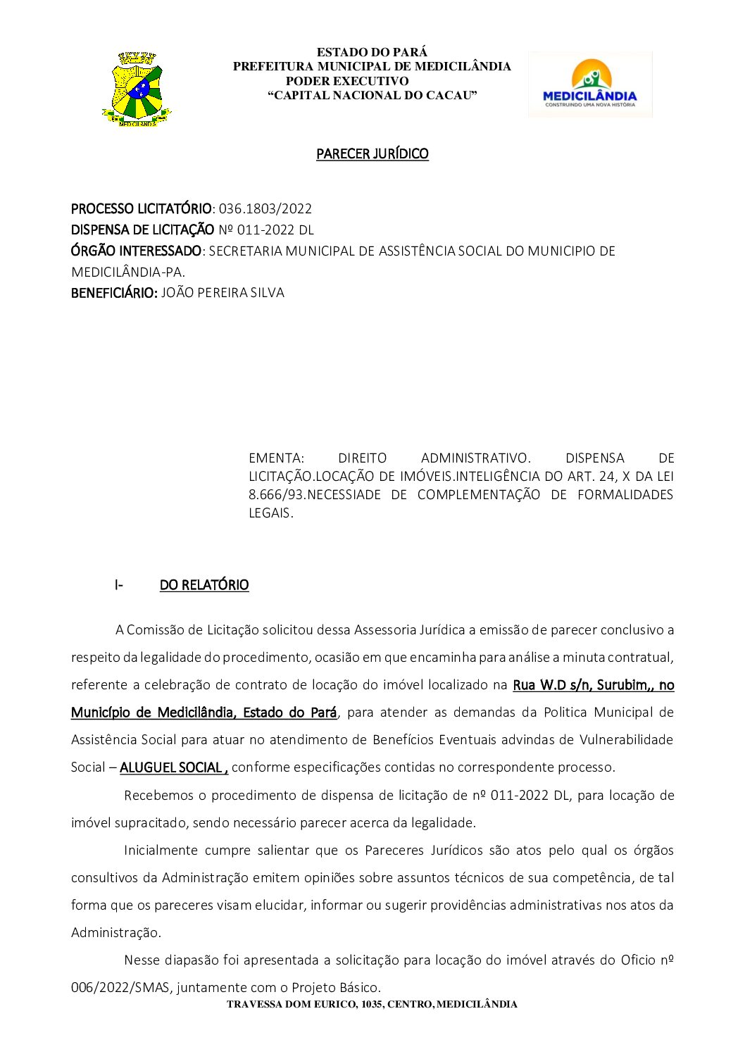 PARECER DL 011-2022 MEDICILANDIA – ALUGUEL SOCIAL – JOÃO PEREIRA